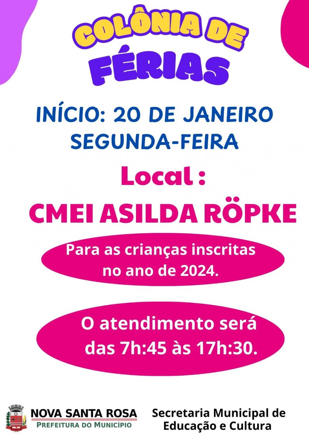 A Prefeitura de Nova Santa Rosa, por meio da Secretaria de Educação, comunica aos pais que fizeram inscrição de seus filhos para frequentarem a Colônia de Férias, que o atendimento às crianças iniciará na segunda-feira (20).