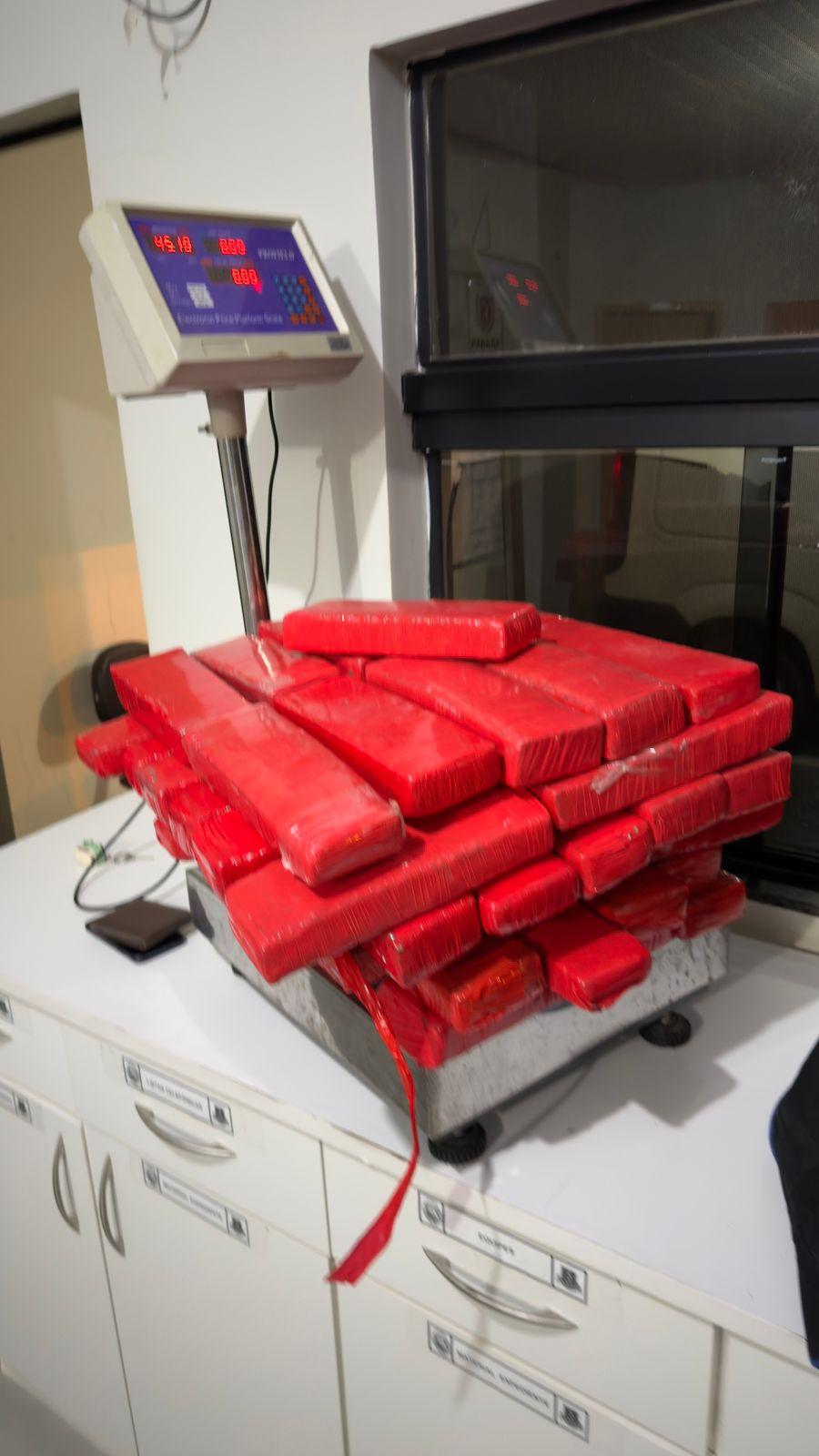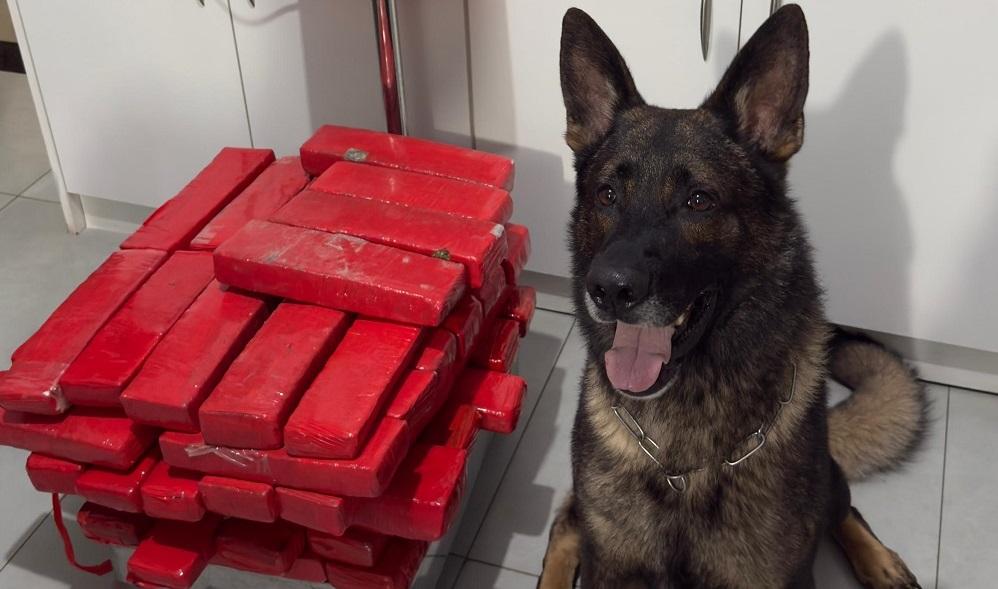 Na primeira averiguação, os policiais localizaram uma bolsa contendo diversos tabletes de maconha. Em seguida, outra bolsa com o mesmo entorpecente foi encontrada na cabine do veículo. Dando continuidade à busca, o cão voltou a indicar o painel do automóvel, onde, sob o porta-luvas, foram localizados mais três tabletes da droga.