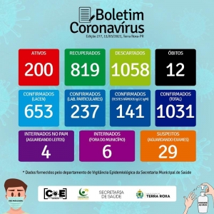 No boletim da Secretaria de Saúde divulgado nesta quinta-feira, o município apresentava 200 casos ativos para a Covid-19, 29 pacientes com a suspeita, 04 internados e 12 óbitos.