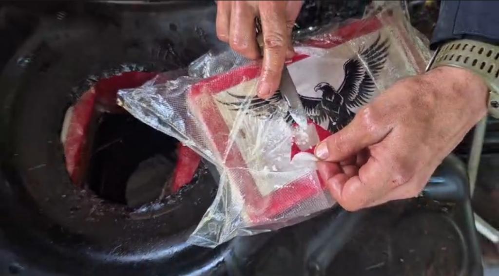 Na vistoria detalhada, os agentes localizaram 46 tabletes de cocaína ocultos no interior do tanque.