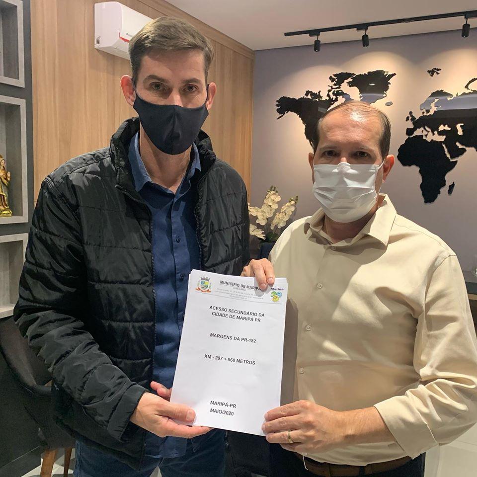 O prefeito Anderson Bento Maria entregou na sexta-feira (15) ao deputado estadual, Marcel Micheletto, o projeto técnico para implantação de um trevo no entroncamento da rodovia PR 182, - na altura do quilômetro 298 - com a MR 103, acesso secundário que liga a sede do Município de Maripá à rodovia. O objetivo agora é buscar apoio financeiro junto ao Governo do Estado para efetivar a obra, que está orçada em R$ 1.465.696,07.