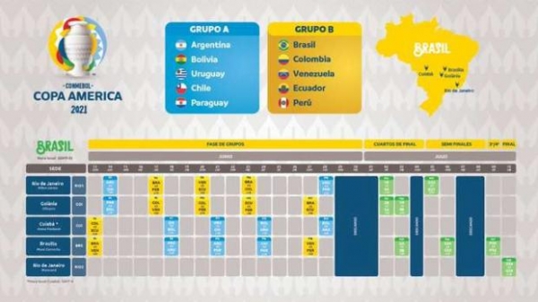 As semifinais estão previstas para os dias 5 (20h, no Nilton Santos) e 6 (22h, no Mané Garrincha) de julho. A disputa do terceiro lugar está marcada para 9 de julho, às 21h, em Brasília. A final da Copa América será em 10 de julho, às 21h, no Maracanã, no Rio de Janeiro.