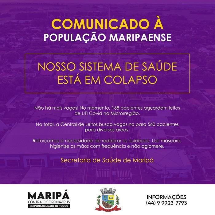A Secretaria de Saúde de Maripá emitiu na tarde desta quinta-feira (10) um alerta a população sobre o colapso no sistema de saúde. De acordo com o comunicado não há mais vagas para atendimento à pacientes que precisam de tratamento intensivo. “No momento, 168 pacientes aguardam leitos de UTI Covid na Microrregião.