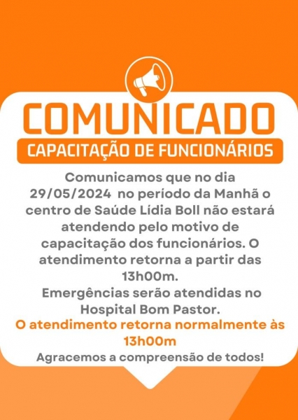 A Prefeitura de Nova Santa Rosa, através da Secretaria Municipal de Saúde, informa que amanhã (29) no período da manhã o Centro de Saúde Lídia Boll não estará atendendo pelo motivo de capacitação dos funcionários.