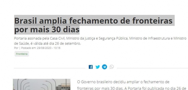 No dia 29 de agosto de 2020 foi veiculada no Portal Nova Santa Rosa uma matéria sobre o fechamento de fronteiras intitulada “Brasil amplia fechamento de fronteiras por mais 30 dias” conforme o link (https://portalnovasantarosa.com.br/noticia/brasil-amplia-fechamento-de-fronteiras-por-mais-30-dias).