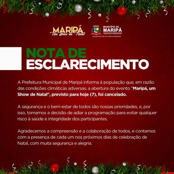 Em razão das condições climáticas adversas, a Prefeitura Municipal de Maripá informa que a abertura do evento "Maripá, um Show de Natal", prevista para hoje (07), foi cancelada. A segurança e o bem-estar de todos são nossas prioridades, e por isso decidimos adiar a programação.