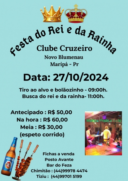 Estará sendo realizado no próximo domingo (27), no Clube Cruzeiro de Novo Blumenau, município de Maripá, mais uma grande festa de Rei e Rainha. A comunidade convida a todas as pessoas do local e municípios vizinhos para prestigiar esta tradicional festa.