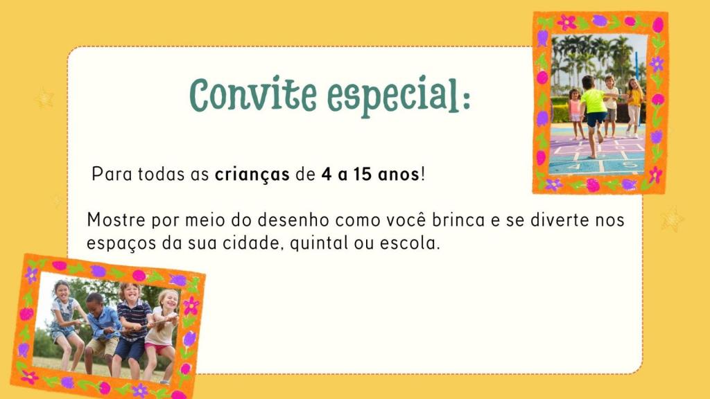 A proposta é valorizar tanto as brincadeiras tradicionais — como amarelinha, esconde-esconde, pular corda, bola de gude, futebol e balanço — quanto as formas criativas que fazem parte do cotidiano de cada criança. Segundo a organização, cada trabalho deve retratar o olhar infantil sobre os lugares que marcam a infância: a praça, o pátio da escola, a rua com os amigos, o quintal de casa ou qualquer outro espaço especial.