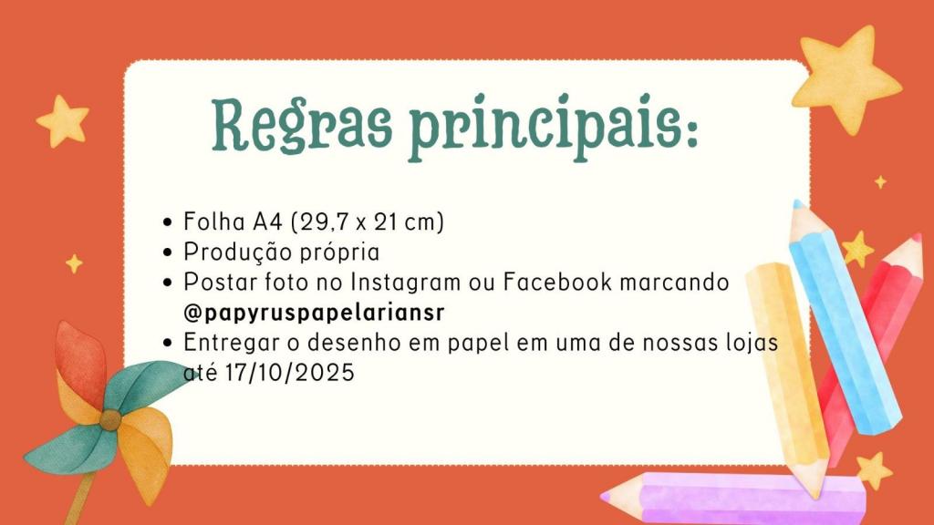 - É obrigatório postar uma foto da criança com o desenho finalizado no Instagram ou Facebook, marcando @papyruspapelariansr.