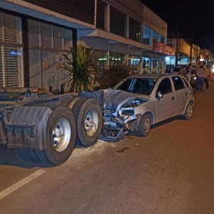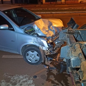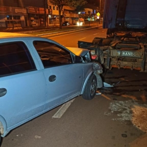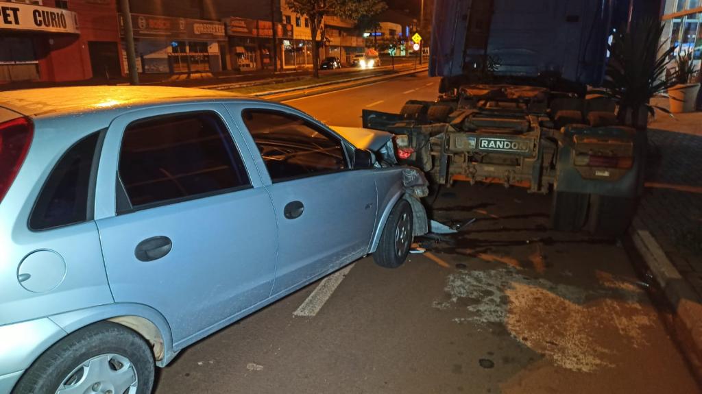 O Corsa bateu atrás de um cavalo mecânico modelo Scania 360 na noite deste sábado, por volta das 22h30 30 na avenida Parigot de Souza no Jardim Porto Alegre em Toledo.