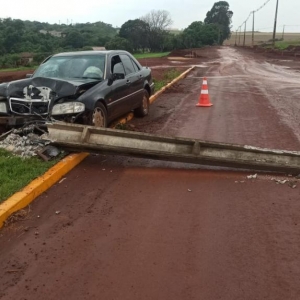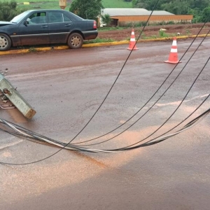 O acidente aconteceu hoje (18) rua Navilio Donassolo, quando o condutor do veículo perdeu o controle da direção ao passar sobre o barro que se formou na pista com a chuva. A forte batida chegou a quebrar e derrubar o poste sobre a via.