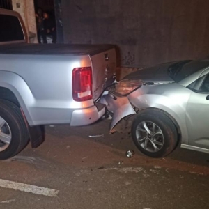Para não bater com a moto ele puxou a direção para o lado direito e atingiu um veículo Citroen C3 com placas Mercosul que estava estacionado e em seguida o Citroen foi jogado contra traseira de uma caminhonete Amarok com placas também do Mercosul que estava estacionada na frente.