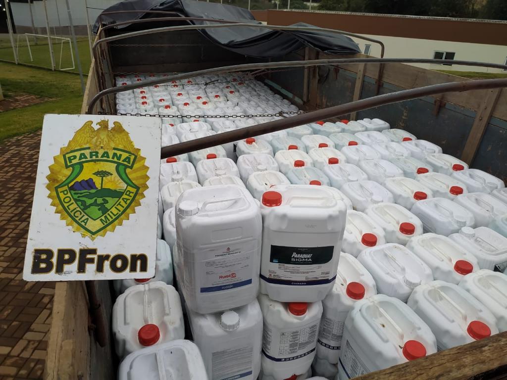 Foi constatado que o veículo estava carregado com 300 galões de 20 litros totalizando 6.000 litros de agrotóxicos contrabandeados.
