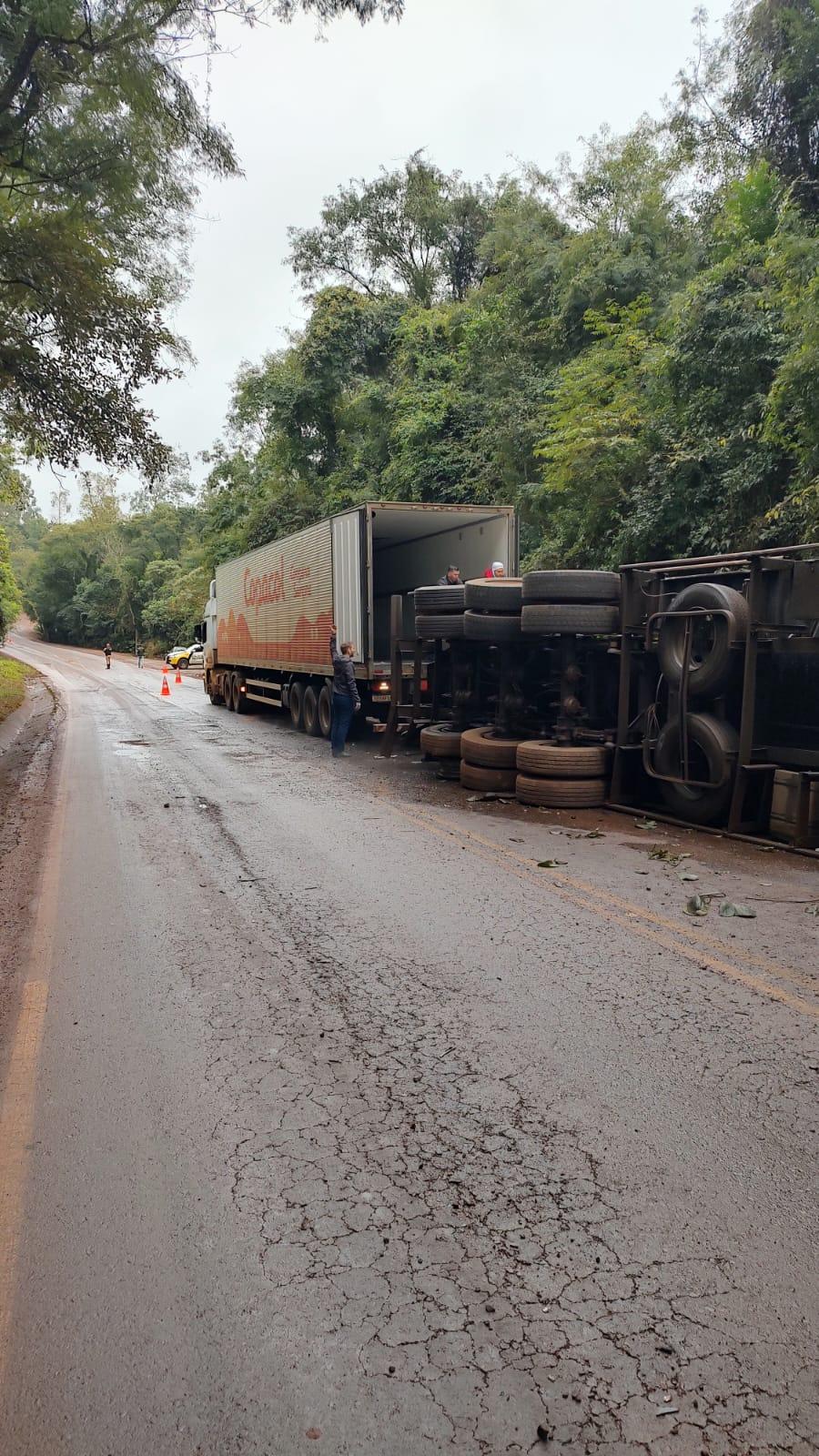 O condutor de 42 anos seguia com o trator Scania R440 na rodovia estadual PR 574 em Corbélia na manhã de hoje sexta-feira quando tombou as margens da rodovia.