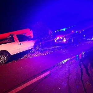 De acordo com informações da Polícia Militar, um veículo Fiat Strada, de cor branca, colidiu contra um poste após subir no canteiro central, arrancando uma placa de sinalização e derrubando o poste.