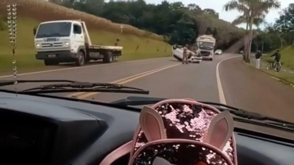 Segundo informações, o condutor de um Fiat Mobi estava vindo de Pato Bragado para Entre Rios, quando em uma curva, perdeu o controle do veículo e capotou.