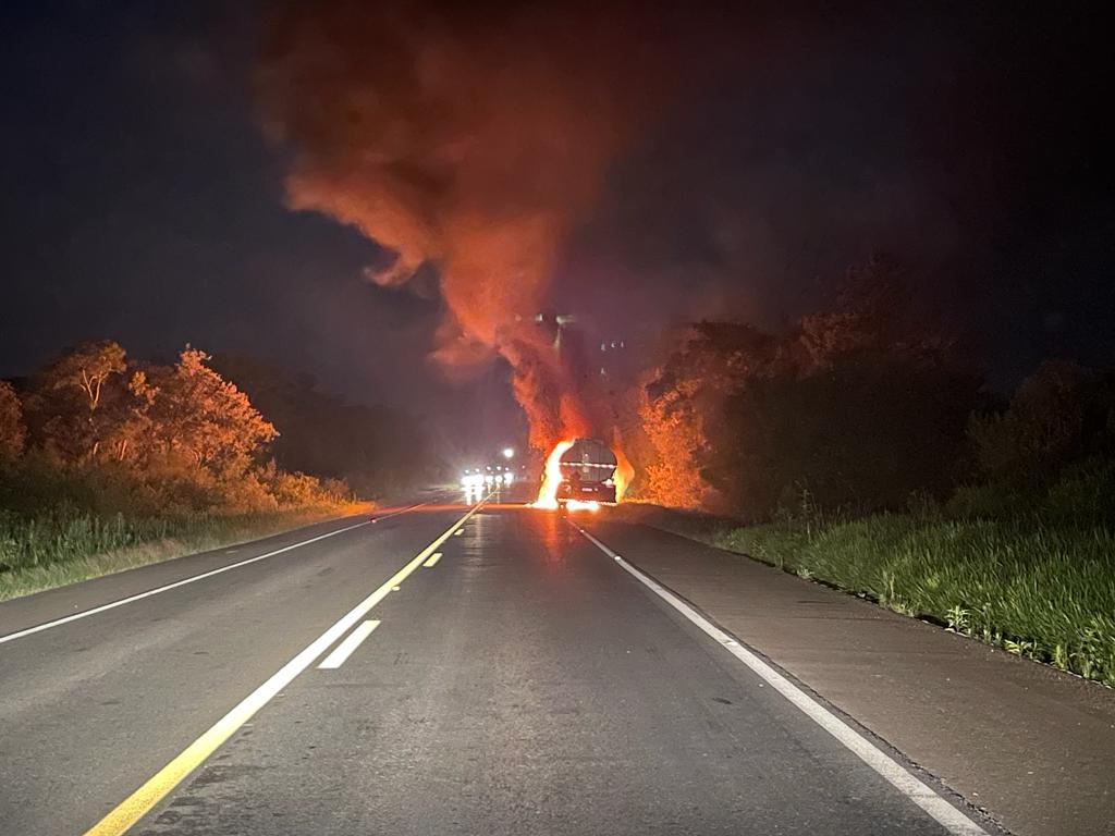 O condutor de um caminhão de transporte de combustíveis saiu ileso, após o veículo incendiar por volta das 22h00 da noite de quinta-feira (26).
