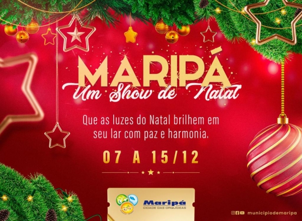 O Município de Maripá por meio da Secretaria de Cultura e Esportes realiza, de 7 a 15 de dezembro, mais uma edição do evento “Maripá, Um Show de Natal”. As atrações terão entrada gratuita e ocorrerão no Lago Municipal, exceto nos dias 10 e 12, quando a programação ocorre nos distritos de Pérola Independente e Candeia, respectivamente.
