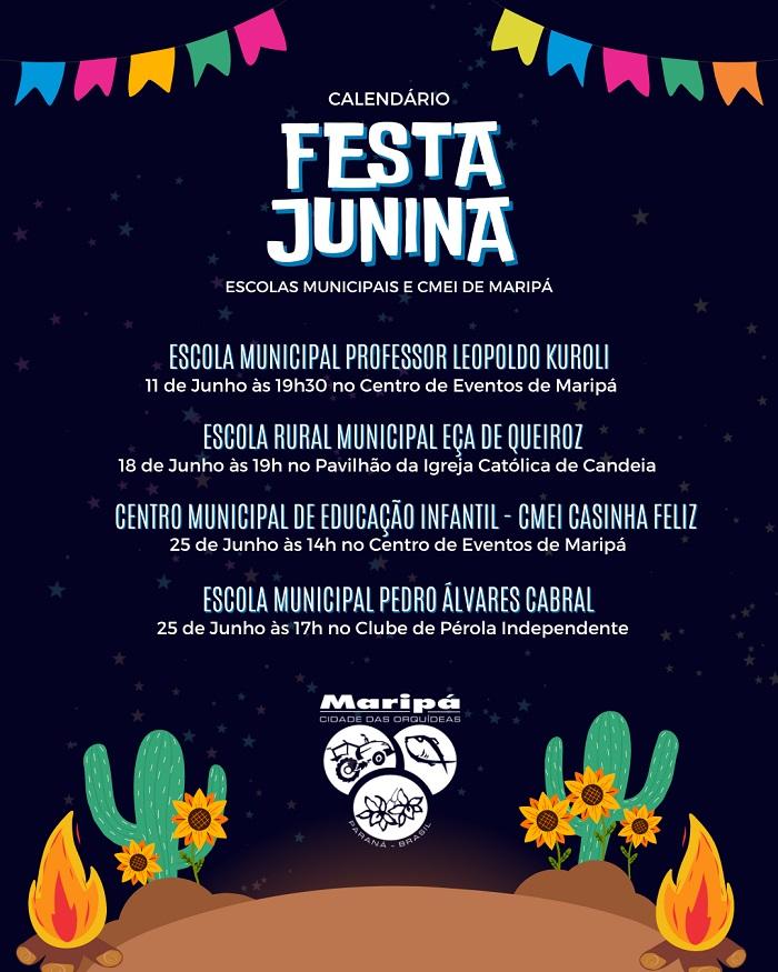 Mês em que celebramos São João, junho terá as tradicionais festas juninas realizadas pelas escolas municipais e CMEI de Maripá. O calendário de eventos foi divulgado pela Secretaria de Educação, Cultura e Desporto nesta segunda-feira (6). Confira as datas: