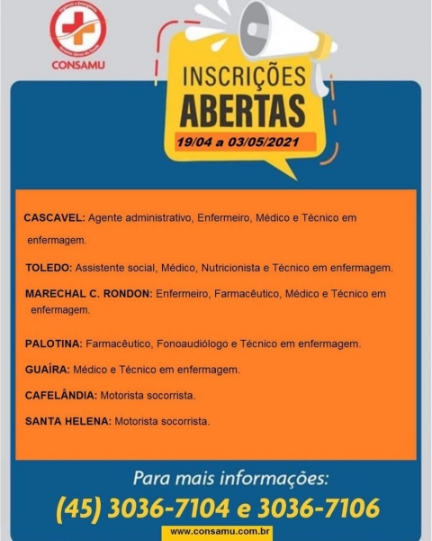 São vagas para agente administrativo (uma vaga, mais reserva), assistente social (uma vaga, mais reserva), fonoaudiólogo (uma vaga, mais reserva), médico (oito vagas, mais reserva), técnico de enfermagem (55 vagas, mais reserva), enfermeiro (duas vagas, mais reserva), farmacêutico (três vagas, mais reserva), motorista (duas vagas, mais reserva) e nutricionista (uma vaga, mais reserva). As inscrições prosseguem até o dia 3 de maio, na sede do Consamu/Setor de Recursos Humanos (Rua Uruguai, 283 – Bairro Alto Alegre, Cascavel-PR), das 8h30 às 11h30 e das 14h às 17h, de segunda a sexta-feira (exceto feriados).