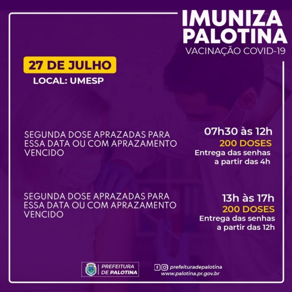Nesta terça-feira dia 27 de julho, a equipe de vacinação vai continuar imunizando as pessoas que estão com a segunda dose atrasada ou agendada para esta data. Serão disponibilizadas 200 doses da vacina na parte da manhã, das 07h30 às 12h00 e outras 200 doses na parte da tarde das 13h00 às 17h00.
