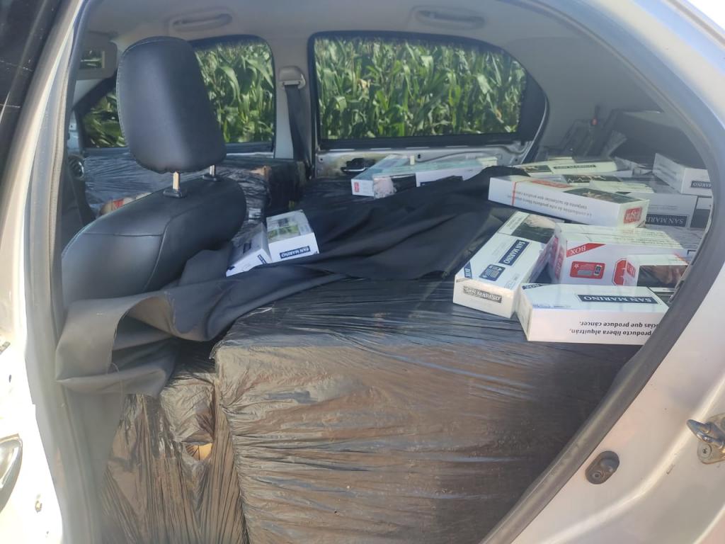Foi então feito acompanhamento tático ao veículo que após alguns quilômetros adentrou em uma estrada rural e o condutor abandonou o veículo em movimento e se embrenhou numa plantação de milho e um matagal existente nas proximidades sendo que foram feito buscas pelos policiais envolvidos porém sem lograr êxito na localização do contrabandista.