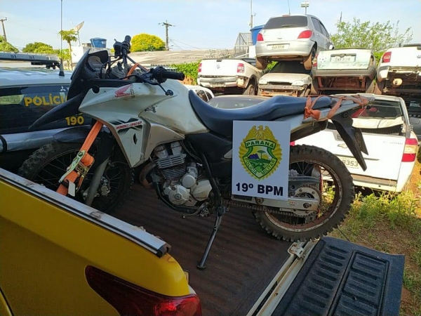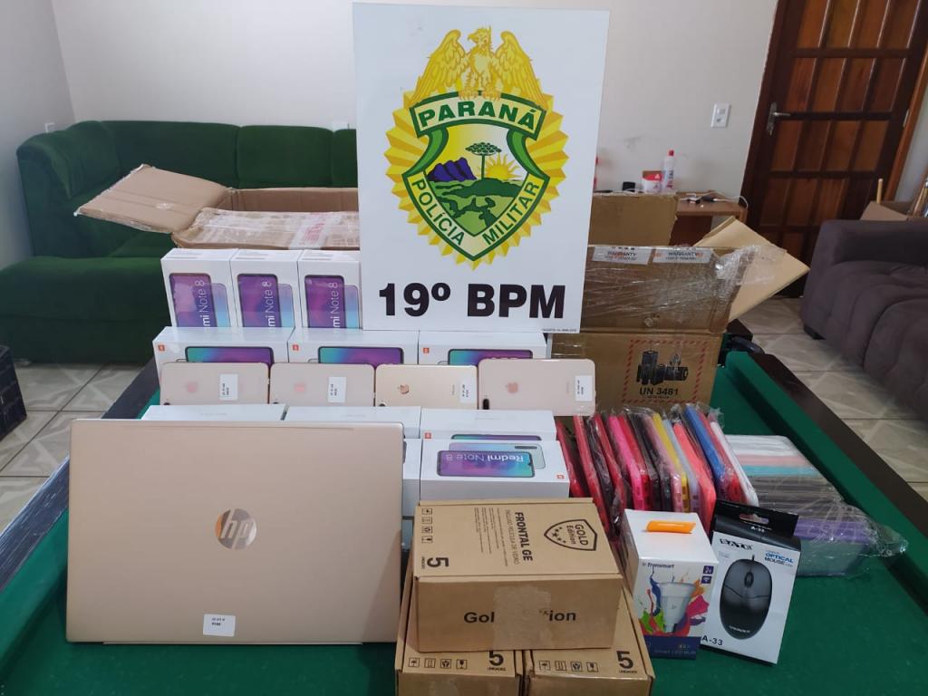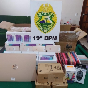 Na motocicleta abandonada continha um volume embalado em caixa de papelão amarrado no banco do passageiro, sendo diversos produtos contrabandeados do Paraguai, capinha de celulares, display de celulares, eletrônicos, vários celulares da marca Iphone e Xiaomi e um notebook marca HP.