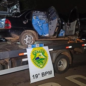 Os policiais militares em patrulhamento na rodovia PR -182, sentido a Ouro Verde do Oeste, avistaram o veículo suspeito em alta velocidade e iniciaram uma perseguição, um tiro foi disparado em um dos pneus, mas o condutor continuou a fuga até que o pneu ficasse totalmente destruído.