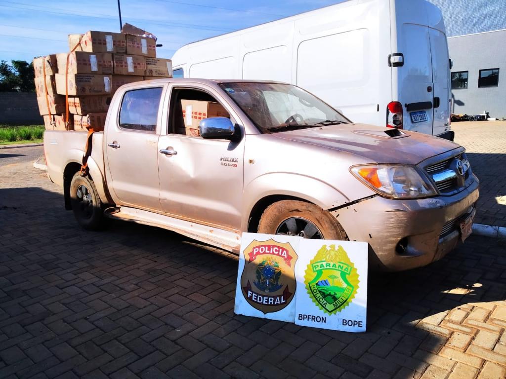 Na madrugada desta segunda-feira, durante patrulhamento nas margens do lago de Itaipu (Zona Rural de Guaíra), equipe policial se deparou com um veículo do tipo camionete transportando visivelmente grande quantidade de cigarros paraguaios. Iniciado o acompanhamento tático, o condutor/criminoso começou a praticar direção perigosa colocando em risco a vida dos policiais e de terceiros (usuários da via pública).