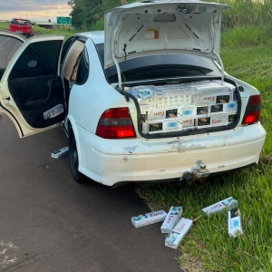 De imediato a equipe fez o retorno na tentativa de abordagem com giroflex, sirene e sinais luminosos, porém o condutor desobedeceu ordem de parada e empreendeu fuga realizando manobras de ultrapassagem em local proibido, forçando passagem entre os veículos por aproximadamente dez quilômetros, quando foi realizada a abordagem, onde constatou ser um veículo GM/Vectra, ostentando placas de Goiânia-GO, o qual era conduzido por um homem de 41 anos, morador de Ribeirão Preto-SP, após buscas no interior do veículo foi localizado em seu interior e porta-malas aproximadamente 1.250 (um mil duzentos e cinquenta) pacotes de cigarros contrabandeados do Paraguai das marcas Calvert e Euro, conforme relato do próprio condutor.