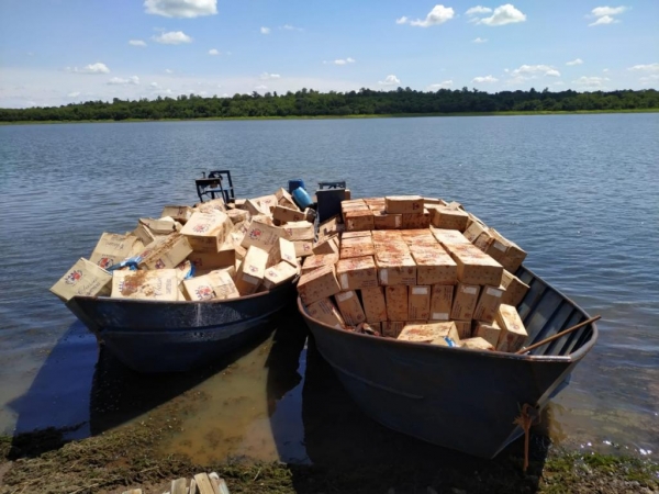 Ao se aproximarem foram localizadas 2 embarcações de ferro com motores 200hp, carregadas com aproximadamente 1000 caixas de cigarros contrabandeados do paraguaio.