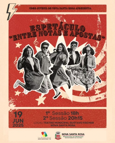Nesta quinta-feira (19), feriado de Corpus Christi, o Coro Municipal Juvenil de Nova Santa Rosa apresentará o espetáculo “Entre Notas e Apostas”, no Teatro Municipal Gustavo Fischer. A atração contará com duas sessões, às 18h e às 20h15. Ingressos estão disponíveis com os coralistas.