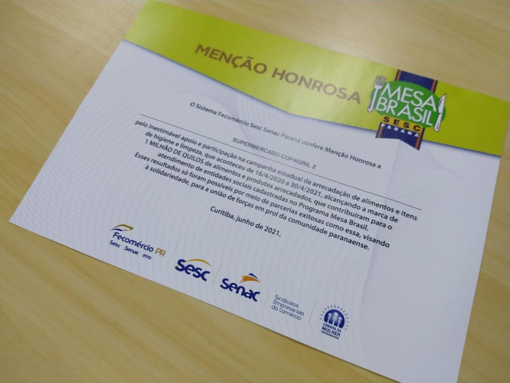 E ainda, Chapla recebeu do Gerente executivo da unidade Sesc Marechal Cândido Rondon, Carlos Cremonini, duas Menções Honrosas direcionadas aos Supermercados de Marechal Rondon. O reconhecimento é pela participação na campanha estadual de arrecadação de alimentos e itens de higiene e limpeza, entre 2020 e 2021, que alcançou a marca de 1 milhão de quilos de alimentos e produtos arrecadados, que contribuíram para o atendimento de entidades sociais cadastradas no Programa Mesa Brasil.