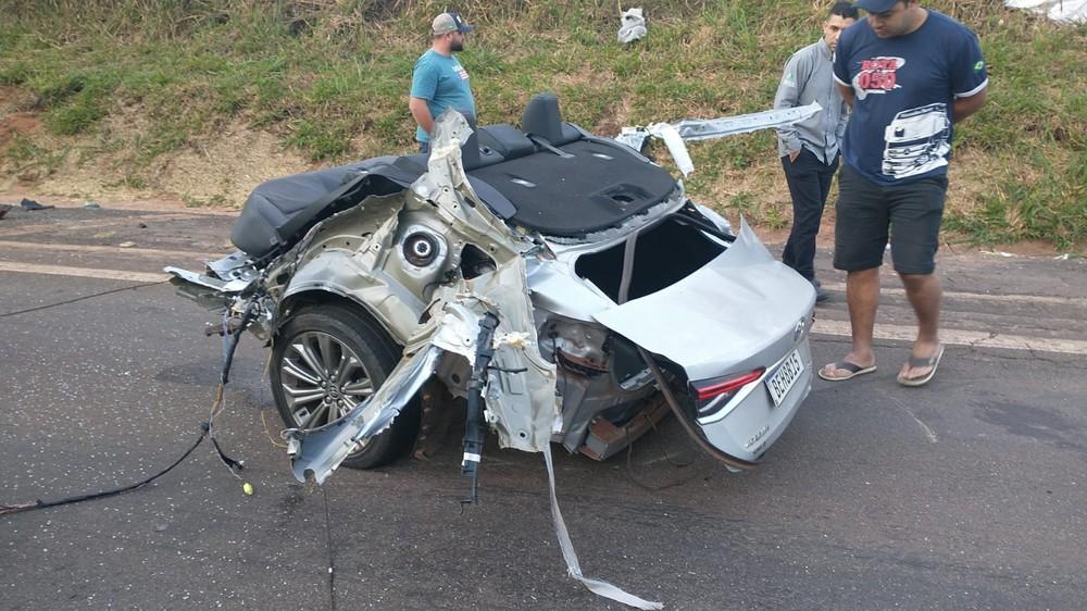 Com o impacto, o Corolla partiu ao meio, sendo que grandes danos foram registrados nos veículos.