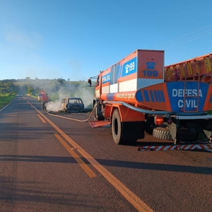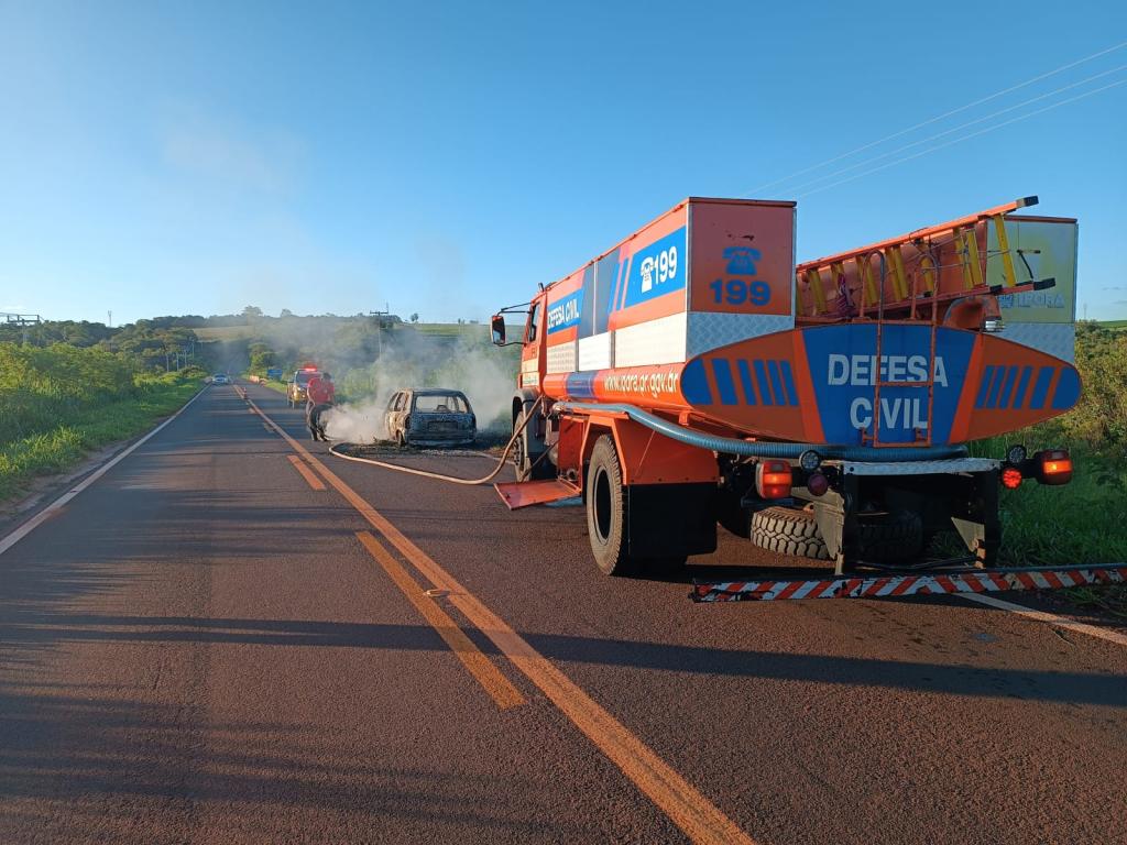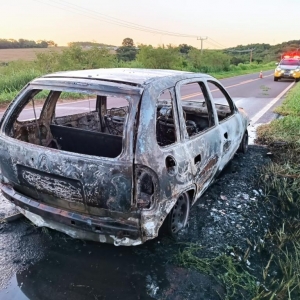 O Corsa Wind, conduzido por um rapaz de 39 anos ficou totalmente destruído pelas chamas no final da tarde deste sábado na rodovia PR-490, entre os municípios de Iporã e Altônia.