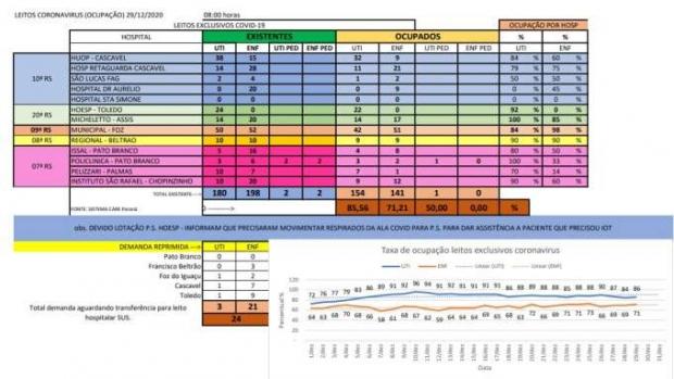 Na macrorregião Oeste, na manhã desta terça-feira (29), a ocupação em leitos de UTI (Unidade de Terapia Intensiva) está em 85,56%. O número representa uma 'sobra' de 26 leitos disponíveis para receber pacientes. Já de enfermaria, dos 198, 141 estão ocupados, o que representa 71,21%.