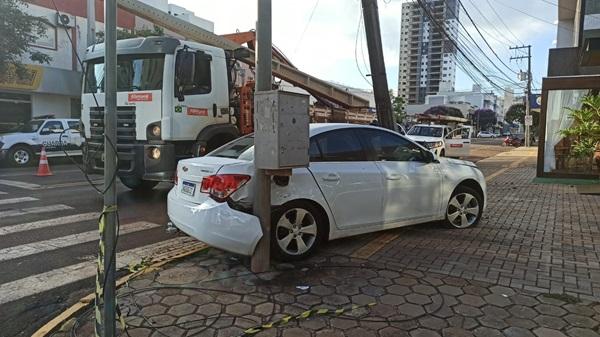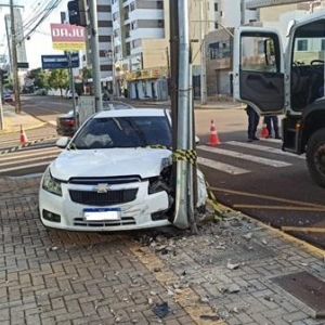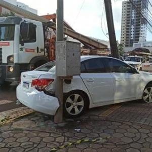 Na madrugada deste sábado no cruzamento da Rua Raimundi Leonardo com Rua Santos Dumont área central de Toledo o veículo Chevrolet Cruze com placas Mercosul trafegava pela via e em determinado momento não se sabe o motivo, o motorista perdeu o controle de direção e avançou sobre a calçada e atingiu um poste de energia elétrica que quebrou devido a força do impacto ficando pendurado pelos fios.