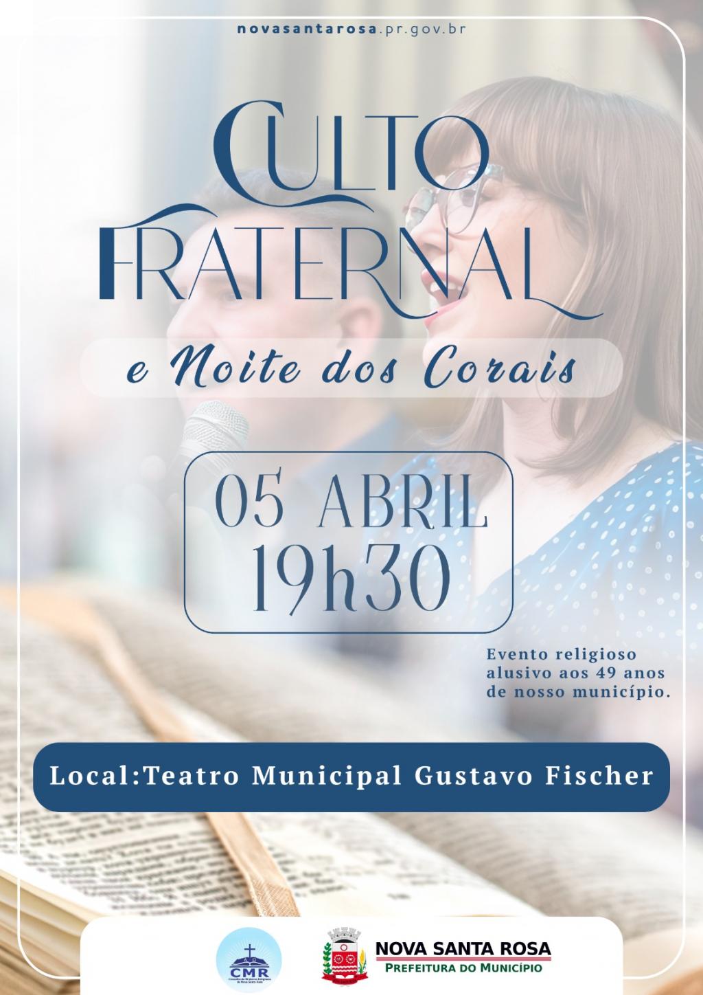 Neste sábado (05), dando sequência na programação alusiva aos 49 anos de emancipação político-administrativa de Nova Santa Rosa, haverá o tradicional Culto Fraternal e Noite dos Corais.