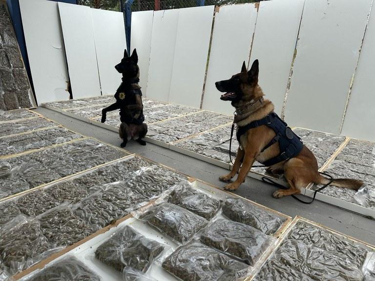 Com o apoio de cães farejadores, os policiais realizaram uma fiscalização minuciosa no compartimento de carga. Os cães indicaram a presença de drogas nas portas, e, ao serem abertas, foram encontrados 124,58 quilos de maconha ocultos no interior das 30 unidades.