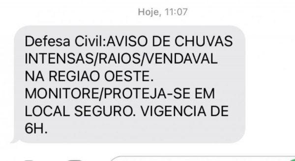 A Defesa Civil do Paraná alerta para o risco de temporal no Oeste do Paraná. O comunicado foi divulgado nesta terça-feira (29), e tem vigência de 6h. Há possibilidade de ventos fortes, chuvas intensas, raios e até granizo.