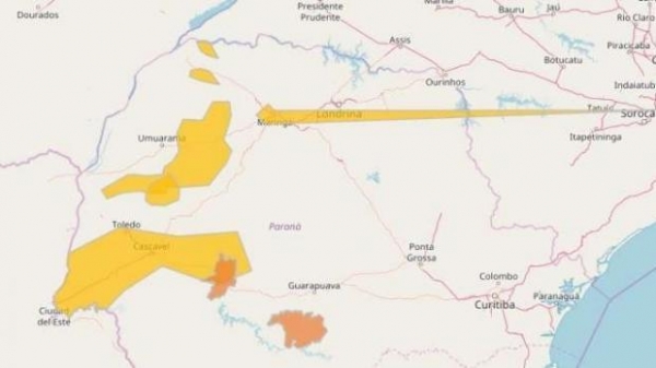 A previsão é de que a chuva venha acompanhada de vendaval e raios que possam atingir a região de Cascavel, Foz do Iguaçu, Umuarama, Maringá e sudoeste do estado.