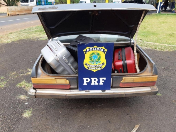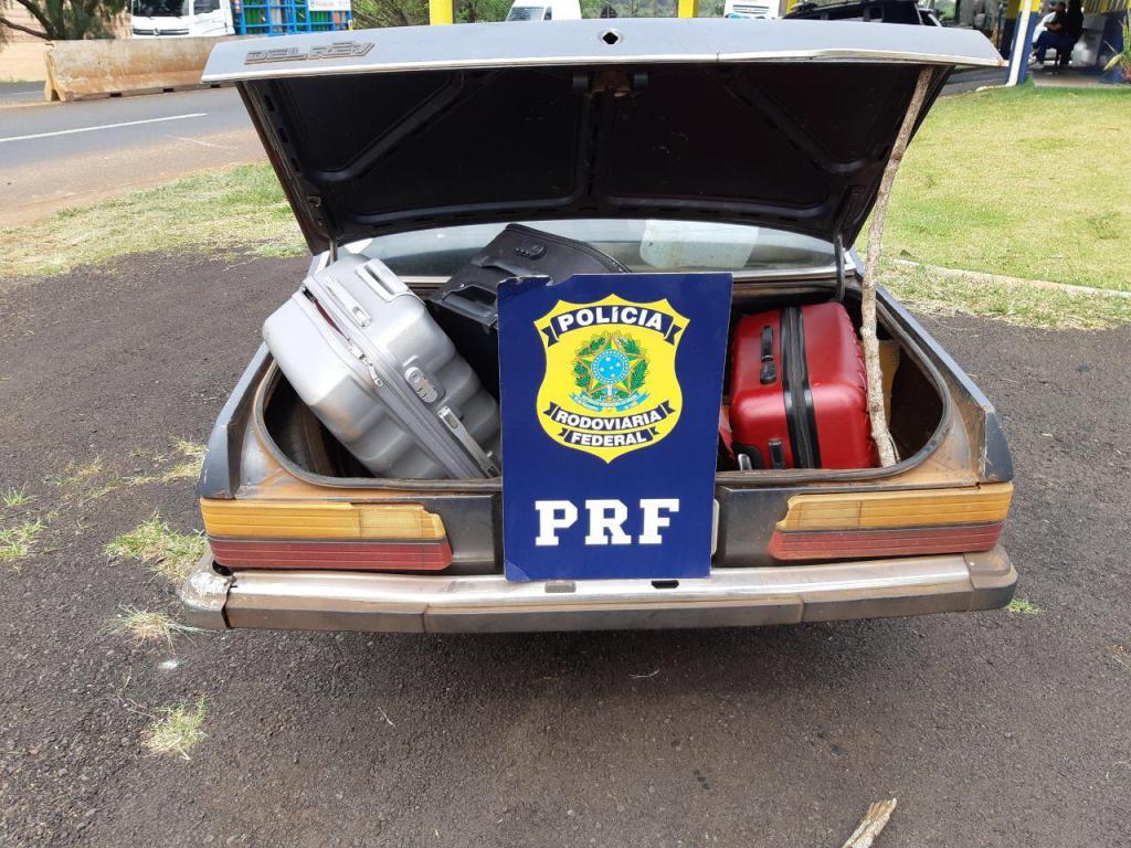 Durante fiscalização no interior do veículo foram localizadas 4 malas de viagem contendo pacotes de cigarro Gudang Garam, provenientes do Paraguai.