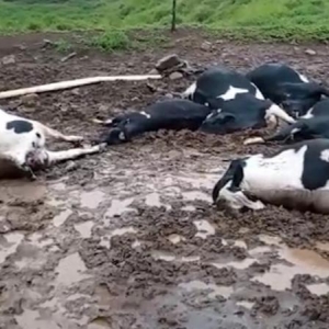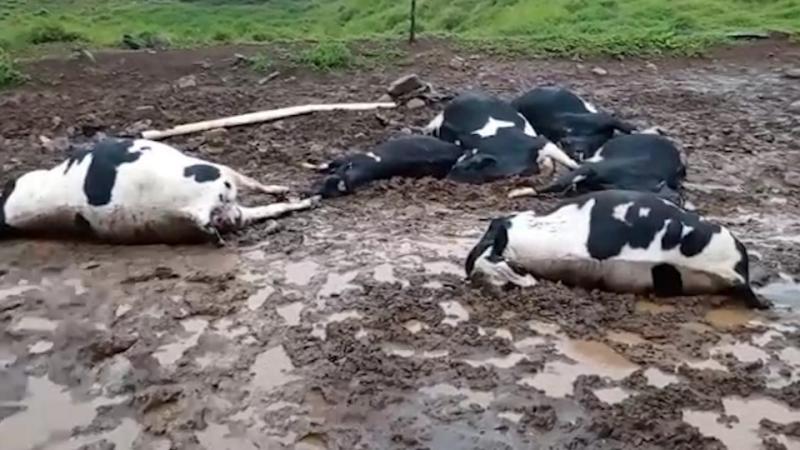 As imagens mostram os animais caídos próximos um dos outros. Segundo os produtores, ventava forte e durante temporal galhos caíram no poste a alguns metros do local conduzindo a energia ao solo.