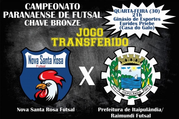 A sétima rodada do Campeonato Paranaense de Futsal – Chave Bronze, que seria disputado neste sábado (26), passou para quarta-feira (30), no Ginásio de Esportes Eurides Priebe, a partir das 21 horas. O Nova Santa Rosa Futsal, enfrentará a equipe da Prefeitura de Itaipulândia/ Raimundi Futsal. A entrada é gratuita e toda a comunidade está convidada a assistir e torcer pela equipe nova-santa-rosense.