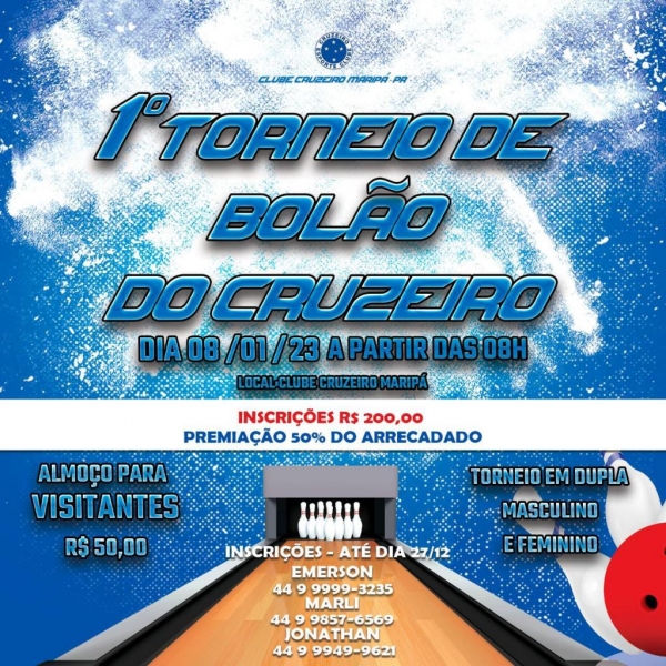 No próximo domingo dia 08 de janeiro acontece o 1° Torneio de Bolão do Cruzeiro em Maripá, inscrições a R$ 200,00 com premiação de 50% do valor arrecadado das inscrições.