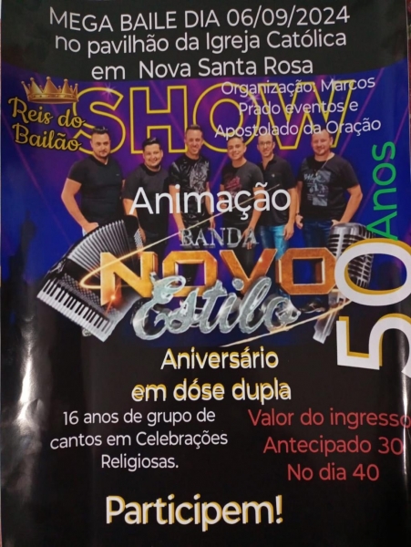 Mega Baile no dia 6 de setembro no Pavilhão da Igreja Católica em Nova Santa Rosa, animação é da Banda Novo Estilo.