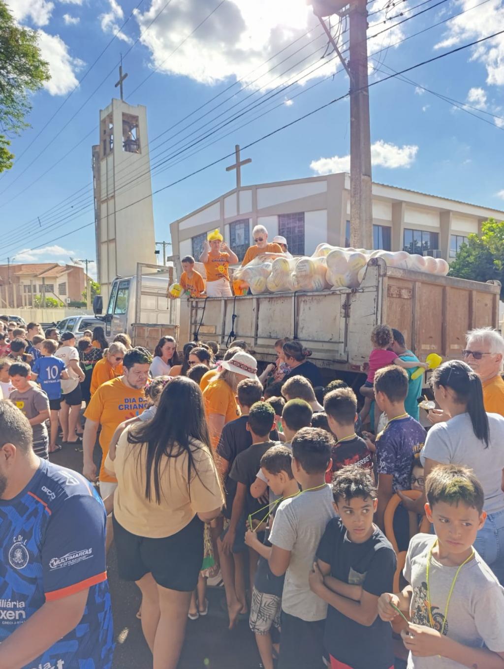 A programação contou com diversas atrações que encantaram o público, como brinquedos infláveis, karaokê infantil e uma variedade de lanches especialmente preparados para a garotada. O ponto alto do evento foi a distribuição de 800 bolas, garantindo que todas as crianças presentes — desde bebês de colo até adolescentes de 14 anos — levassem uma bola para casa como lembrança desse dia especial e inesquecível.