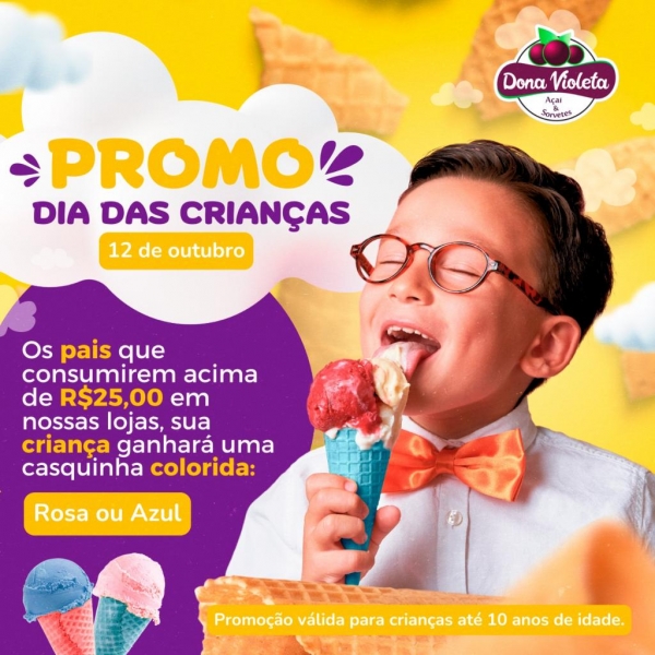 A Dona Violeta Açaí e Sorvetes, de Nova Santa Rosa, está preparando dois dias de promoção especial para o Dia das Crianças.