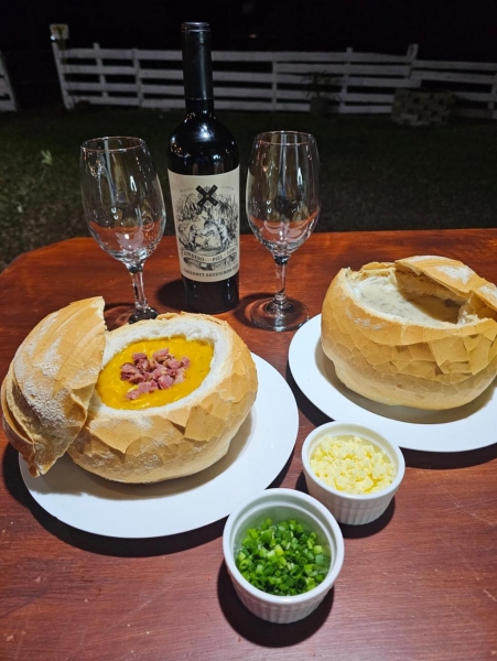- caldo de abóbora cabotiá com frango desfiado e bacon crocante;
