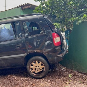 O impacto da batida fez o carro rodar e derrubar o muro de uma residência.
